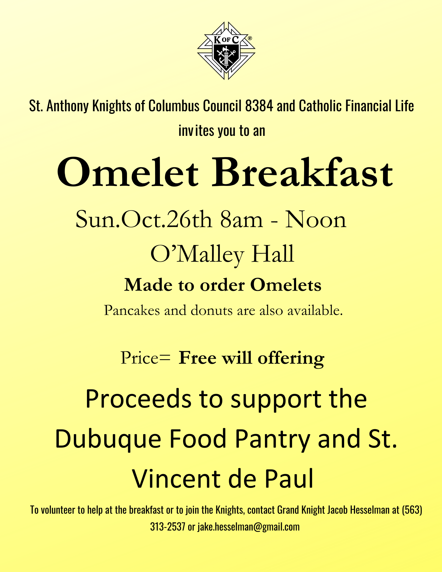 In mid-August I received a phone call from a fellow Knight. He wanted to know if I was aware of the serious illness which had befallen a brother Knight, Mike Steinlage. There had been some prayer requests posted asking for prayers for Mike, but I was not aware that his condition had worsened and he was facing serious risk. (See the full details of Mike’s ordeal on the KC page at http://www.stanthony-dubuque.org ). After being updated about Mike it became apparent that the Knights needed to do something to assist the Steinlage family. The need was now so we wanted to do something sooner rather than later. So we rallied our council members and were able to put together an omelet breakfast fundraiser held on August 30th. Announcements were published, posters were made and thirty of our members volunteered to work the breakfast.